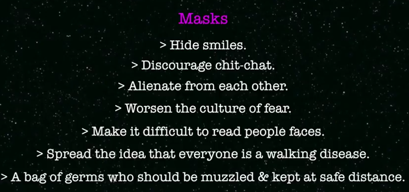 Tieteellinen, tutkimuksiin perustuva analyysi, miksi kasvomaskit ovat tehottomia, tarpeettomia ja vahingollisiaWilkinson Wellness Clinic: Masks: Are They Helpful? Or Are They a Problem? Wilkinson Wellness Clinic: Ovatko maskit hyödyllisiä vai haitallisia?the Blaze: Horowitz: Comprehensive analysis of 50 states shows greater spread with mask mandates Horowitz: perusteellinen analyysi USA:n 50 osavaltion maskimääräyksistä osoittaa enemmän tautitapauksia maskimääräysten ollessa voimassaKun maskimääräykset olivat voimassa, tapauksia oli keskimäärin 27/100000/päivä. Kun maskimääräykset eivät olleet voimassa, tapauksia oli keskimäärin 17/100000/päivä. The Federalist: These 12 Graphs Show Mask Mandates Do Nothing To Stop COVID Maskipakko ei estä koronan leviämistäKuvaajista näkee, miten eri maissa on otettu kasvomaskit käyttöön eri aikoina, mutta koronaluvut seuraavat samoja linjoja ("tauti" on kausiluonteinen). Global Research: Face Masks Pose Serious Risks to the Healthy Kasvomaski muodostaa vakavan riskin terveilleColleenHuberNMD: Mask Microplastics: Have They Arrived to the Lungs? Brittitutkimus löysi mikromuovia keuhkosolunäytteistä, jotka oli otettu leikkaukseen menevistä ihmisistä. Miesten näytteistä löytyi kuusinkertainen määrä naisten näytteisiin verrattuna. Yleisimmin löydetty mikromuovi oli polypropyleeni, joka sattuu olemaan kertakäyttömaskien yleisin materiaali. Study finds plastics found in masks present in patients’ lungs Dr. Mercolan artikkeli 20.12.2021: How Two Hairstylists Changed Our Mask Policy Dr. Mercolan artikkeli 22.6.2022: Mask Mandates Linked to Increased COVID Death Rates Dr. Mercolan artikkeli 24.8.2022: Birds, Other Wildlife Sacrificed for Useless Mask Pollution Dr. Mercolan artikkeli 26.10.2022: Masks Now Found to Contain 2B Carcinogen Tästä jätin pienen osan pois. Dr. Mercolan artikkeli 27.4.2023: The Harms From Wearing Masks Are Real Ian Miller (@ianmSC) on julkaissut mm. tällaisia käyriä Twitter-tilillään. Hän on myös julkaissut kirjan Unmasked: The Global Failure of COVID Mask Mandates tammikuussa 2022. Tom Woods puhuu Ian Millerin kanssa podcastissaan nro 1851 ja 2051. Neljän USA:n osavaltion covid-19-sairaalahoitoa vaativien lukumääriä ND = North Dakota, SD = South Dakota, IA = Iowa, MN = Minnesota Tässä WHO:n dokumentti kasvomaskeista. Sivun 8 alussa: At present there is only limited and inconsistent scientific evidence to support the effectiveness of masking of healthy people in the community to prevent infection with respiratory viruses, including SARS-CoV-2. Vapaa suomennos: Tällä hetkellä on olemassa vain rajallinen ja epäjohdonmukainen tieteellinen näyttö tukemaan terveiden ihmisten maskinkäyttöä jokapäiväisessä elämässä estämään hengitystieinfektioita, mukaan lukien SARS-CoV-2. CDC:n tutkimus julkaistu 11.9.2020, jossa "tartunnan saaneista" 70,6% kertoi käyttäneensä maskia 'aina' ja 14,4% 'usein' kahden edellisen viikon aikana ennen sairastumista. Se on yhteensä 85%, jotka käyttivät maskia vähintäänkin usein ja silti sairastuivat. Luvut löytyvät loppupuolella olevan taulukon ihan lopusta. CDC:n tutkimus julkaistu toukokuussa 2020, jossa todetaan (mm.), etteivät kasvomaskit ja käsien pesu estä influenssan leviämistä. Ben Swann, Sovren Media: Yes, Fauci Email Proves He Knew Face Masks Don't Work The Sequel To The Fall Of The Cabal - Part 20 Katso, mitä MIES tarkoittaa. The Absurdity of Masks by Dr Andrew Kaufman Dr. Andrew Kaufman: maskien järjettömyysIltalehti: Lääkärilehti: Neuvolalääkärin havainto korona-ajasta – vauvat eivät hymyile kuten ennen Vapaa suomennos 7.3.2022 Children's Health Defense -artikkelista Instead of Admitting Mask Mandates Harm Kids, CDC Lowers Expectations for Speech Development |